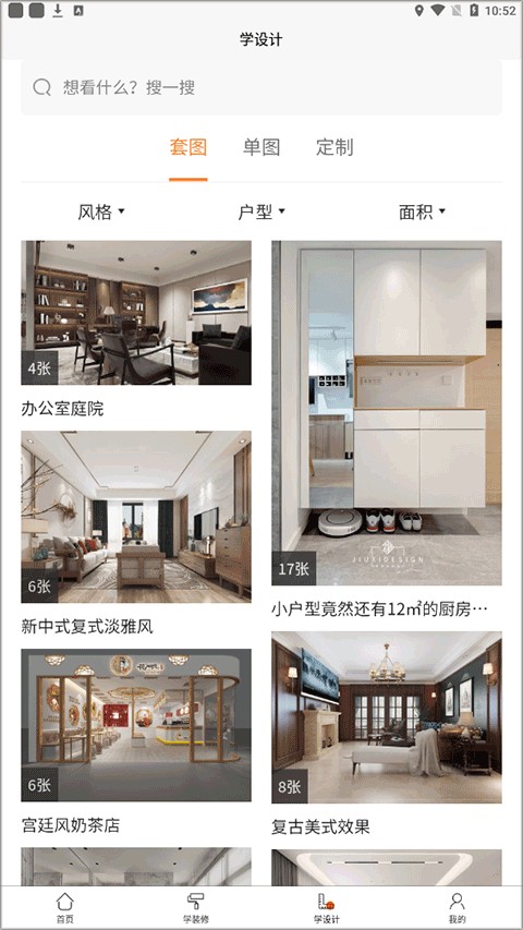 3在设计学习板块,我们准备了海量的装修效果图、装修图册,还有当地小区的真实装修案例,方便您参考,让您提前感受未来家的模样。