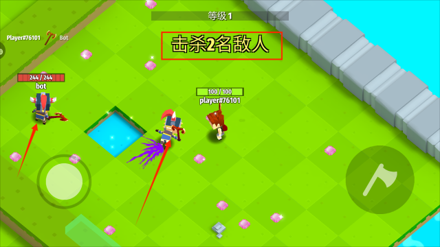 1、核心玩法为俯视角竞技场对战,玩家通过虚拟摇杆操控角色移动,点击按钮即可投掷武器。击败对手可获得积分,最终存活到最后的玩家将赢得胜利。