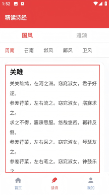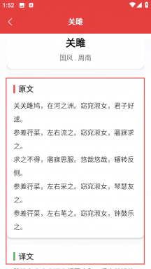 4在《关雎》的详情页面中,用户能够查看该诗歌的原文与译文等相关内容,从而更深入地学习这部诗经中的经典篇目。