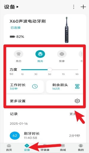 2、进入设备页面,成功连接声波电动牙刷后可自定义亮白、抛光、按摩等模式,并调整清洁力度。
