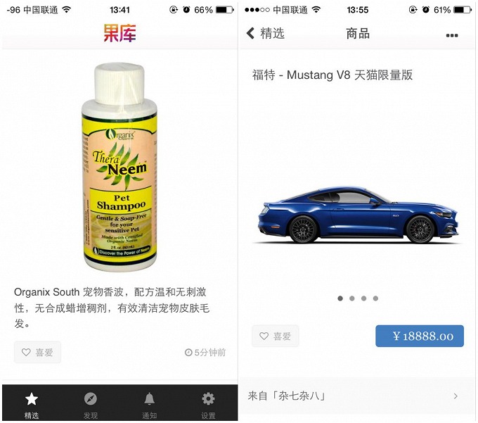 可以通过新浪微博和微信,把你在「果库」的发现分享出去,还能@ 上你的好友。