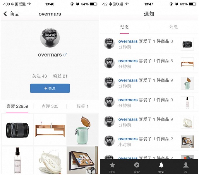 第三个标签页是“通知”,不过它其实也兼具个人中心的功能——在这里你能查看自己收藏过的所有商品,简直是剁手爱好者的专属购物天堂。剁手前把心仪的物品都“加入收藏”,这个特殊的“收藏夹”永远不会清空(毕竟想买的东西实在太多啦)。我总爱收藏,却很少真的下单,毕竟还是很珍惜自己的手~另外,这里还能看到关注对象的最新动态,也算是分享经济的一种小体现呢。