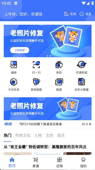 宗谱链是一款致力于家谱文化传承与发展的创新型应用软件。它通过线上数字化的方式,为用户提供了一个便捷、高效的家谱管理与传承平台。此外,它还提供了多种实用功能服务,满足用户在家族文化传承过程中的多样化需求,也为用户提供了丰富的福利和乐趣。