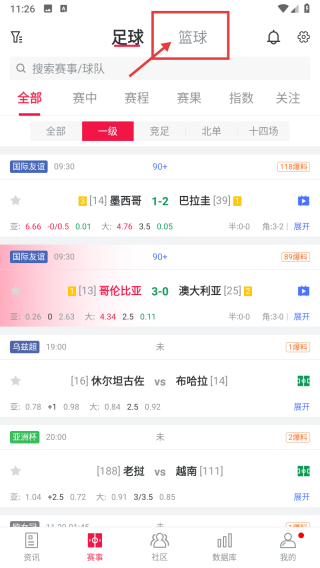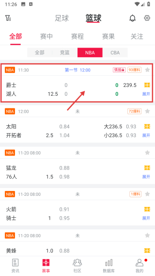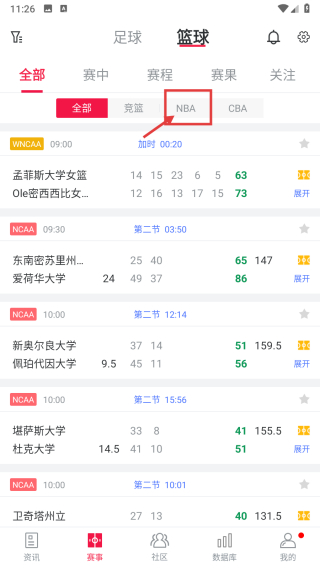 1、打开体育赛事类应用,点击顶部的篮球分类选项,进入篮球赛事页面。