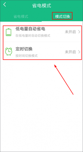 3、点击【模式切换】,这里是自动设置:用户可设置低电量自动开启省电模式,或是定时开启省电模式,这样更方便用户能长时间使用手机。
