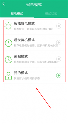2、在【模式】页面,点击【省电模式】;即为手动设置:用户可根据自己手机电量情况,设置适合当前情况的省电模式。