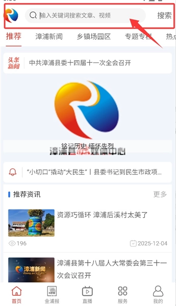 1、打开金漳浦后,您可通过搜索文章功能快速查找本地资讯、政策解读或特定事件相关内容。