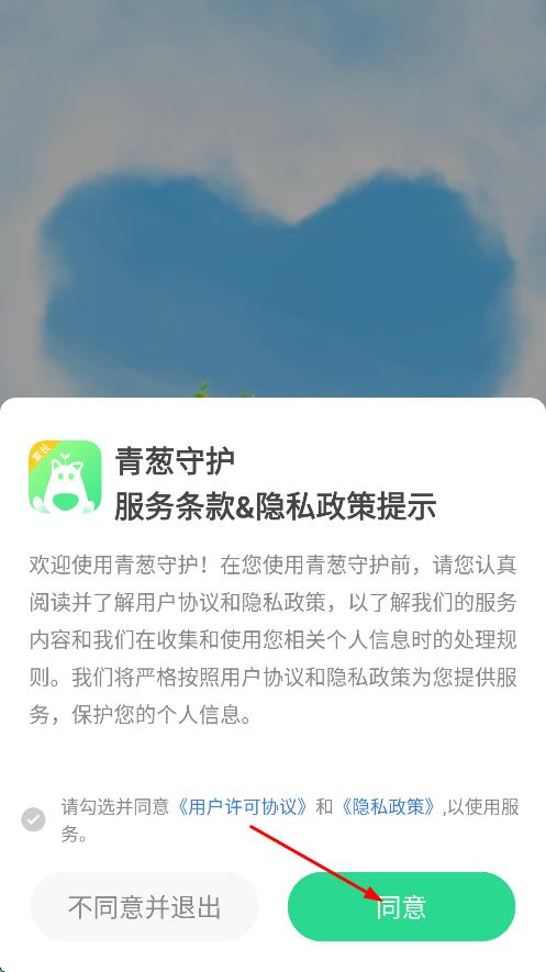 1、在青葱守护服务条款与隐私政策的提示弹窗里,点击“同意”按钮,即可进入设备待添加页面。