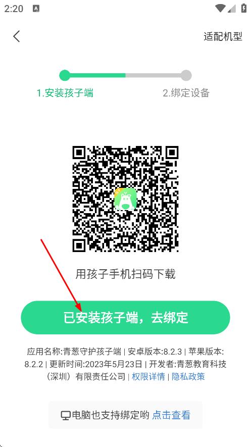3、进入孩子端安装相关页面后,点击“已安装孩子端”选项进行绑定操作,随后会跳转至扫码绑定页面。