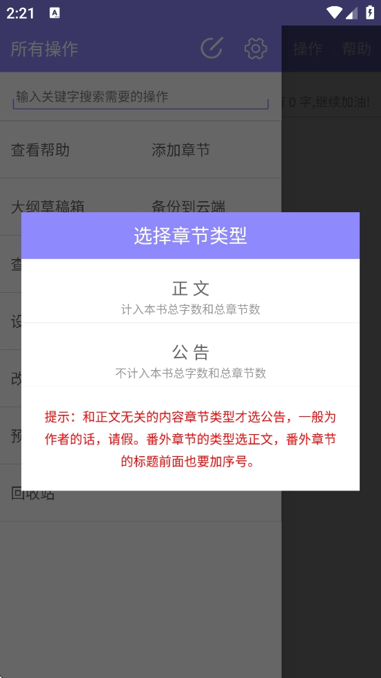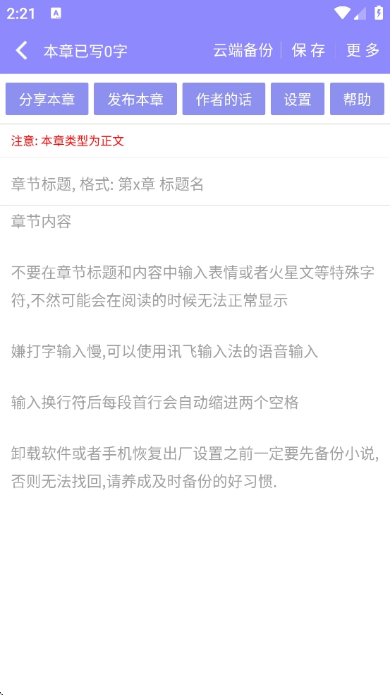 5、输入章节内容,开始你的小说创建之旅吧