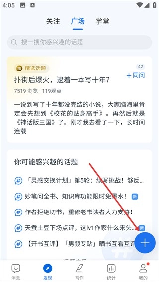 2、在发现广场页面,点击右下角的蓝色加号按钮。