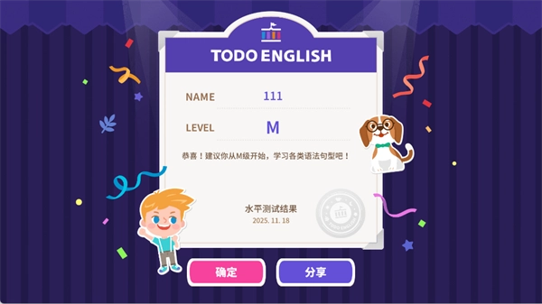 测试结束后,查看结果(如示例中的 M 级),点击 “确定” 进入对应级别学习。