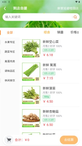 3把需要的水果、蔬菜、禽类和调味品等商品添加到购物车后,点击“去结账”按钮。