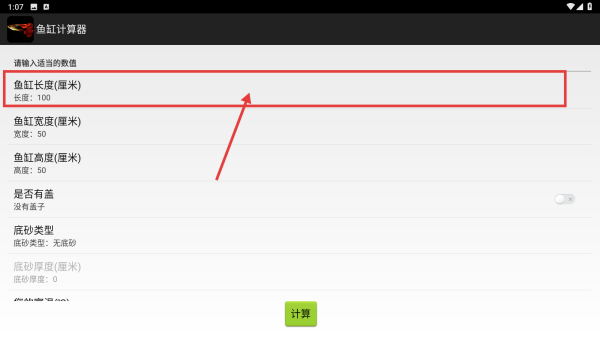 1、打开鱼缸计算器,点击用于输入鱼缸长度(单位为厘米)的输入框,对长度数值进行修改。