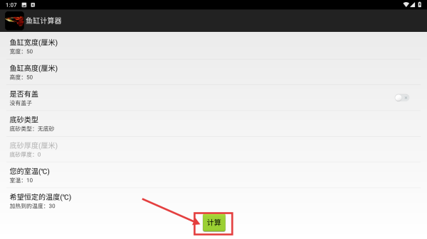 3、完成其他鱼缸参数的检查后,点击“计算”按钮,即可得到鱼缸的相关计算结果。