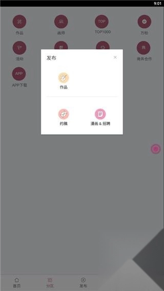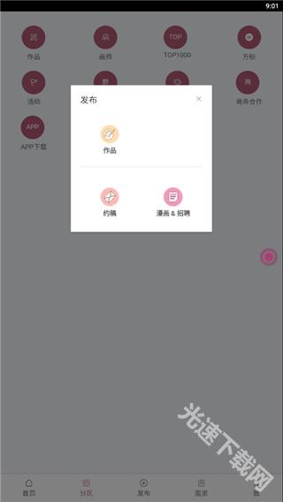 4、点击发布按钮,你既能够发布自己的作品,也可以进行约稿操作,还能发布漫画相关的招聘信息。