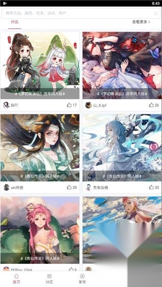 3、切换至分区界面,能够查看作品、画师以及TOP100的作品。