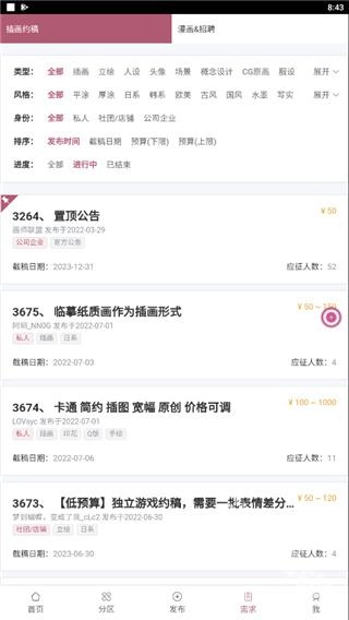 在软件的需求板块,你既能浏览各类插画约稿信息,也能发布不同类型的漫画招聘需求。