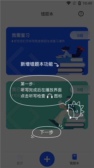 6、回到首页后进入错题本板块,这是新增加的功能,完成听写后可在播放界面查看耳机图标。