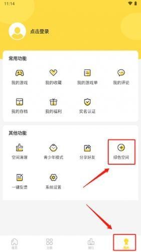 1、打开闪玩,在【我的】页面点击“绿色空间”。