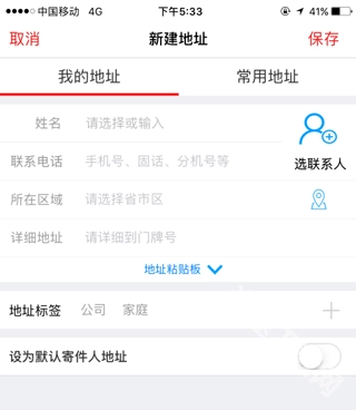 4、接着在下方的这个页面里,你可以填写寄件人的详细信息,像联系方式、具体地址等,填好后点击右上角的保存按钮。保存好这个地址后,后续寄件时就无需再重复输入了。