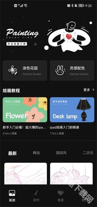 1、首先大家进入iartbook绘画应用,我先给大家介绍一下各个板块的使用方法和包含内容。在画册板块里,大家可以进行新手入门学习,还能找到最新的各类填色内容。