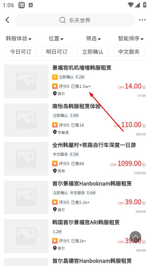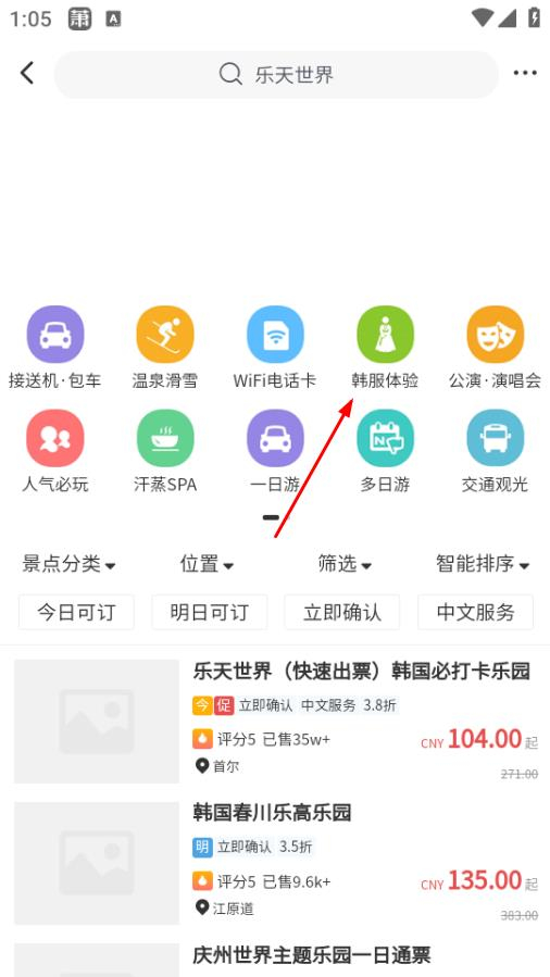 2在景点门票的分类界面中,选择韩服体验选项,即可跳转至韩服体验项目的列表界面。