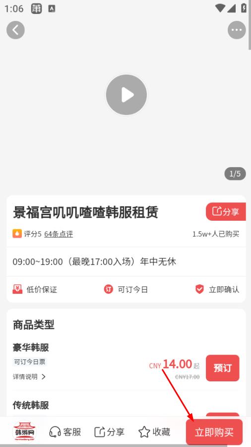 4在项目详情页,找到并点击“立即购买”按钮,即可完成韩服租赁的购买流程。