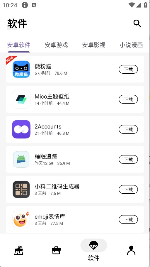 5、软件库页面把各类软件做了细致分类,像安卓软件、影视类以及小说漫画类等类别都包含在内。