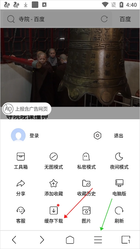 内容可点击页面底部的扩展功能按钮(即下图中绿色箭头所指的按钮),接着点击【缓存】按钮即可。