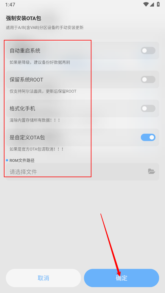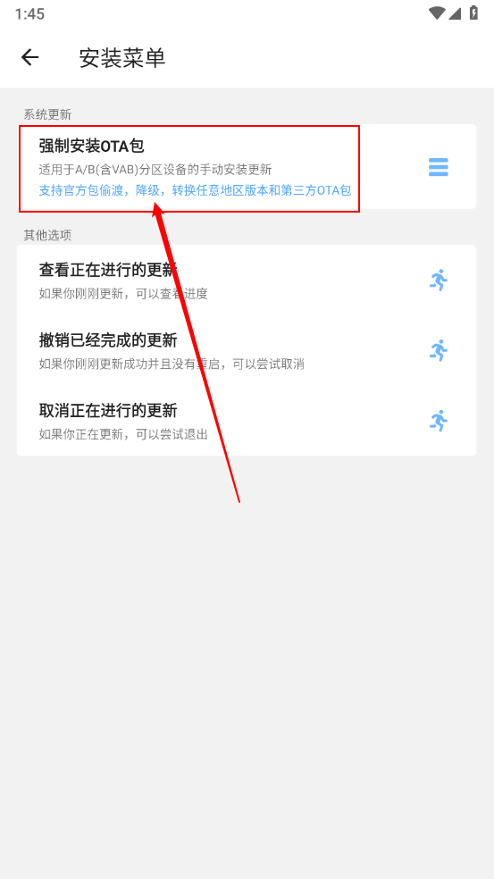 2、在安装菜单页面点击"强制安装OTA包",适用于A/B(含VAB)分区设备的手动安装更新。