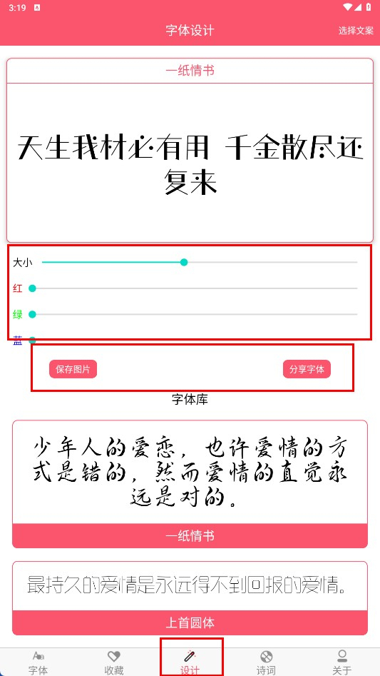 3找到界面底部的“设计”板块,点击其中的“功能按钮”选项,就能进入字体相关的设计界面。在这里,你可以对字体的尺寸、色彩等参数进行调整,完成设置后,还能将当前的设计效果保存为图片,或者把设计好的字体分享出去。