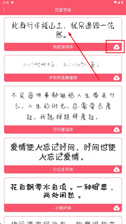 2在可爱字体的展示界面中,能够点击字体旁边的按钮,像“俏皮球球体”这类字体都可以进行操作。