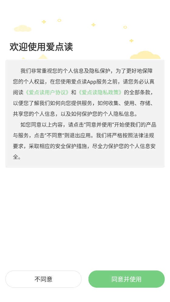 1、先在本站安装爱点读软件,查看相关用户协议和隐私政策。