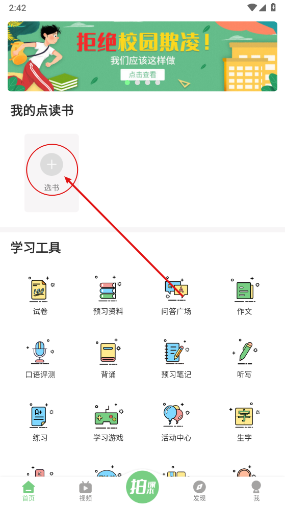 可以使用【拍课本】功能。在爱点读首页底部点击【拍课本】按钮,拿出课本拍一拍,就可以点读了!