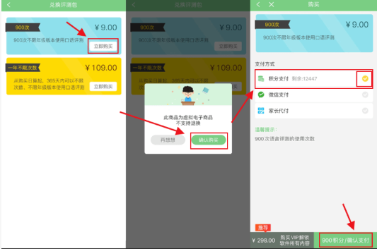 积分目前可以兑换口语评测次数、点读教辅书、背诵次数等。