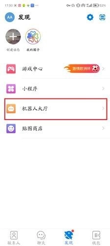 2、在发现版块点击进入“机器人大厅”。