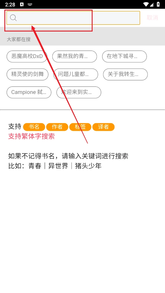 3、也能点击上方的搜索框,输入书名、作者、标签等内容来搜索自己喜欢的小说。