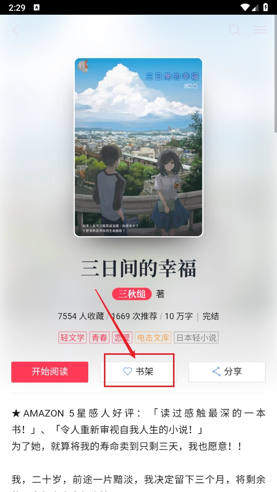 4、最后进入小说详情页,点击书架区域的小爱心图标,就能将小说加入书架了。