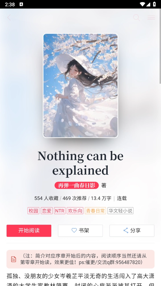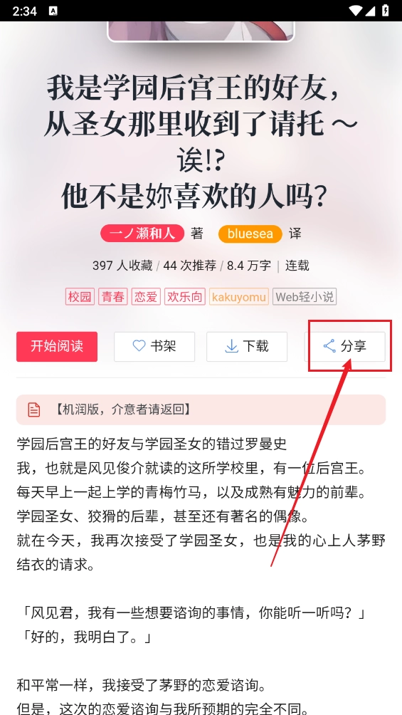 2、进入小说小说详情页,点击"分享",如图。