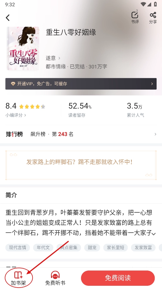 2、在小说详情页中点击"加书架"即可。
