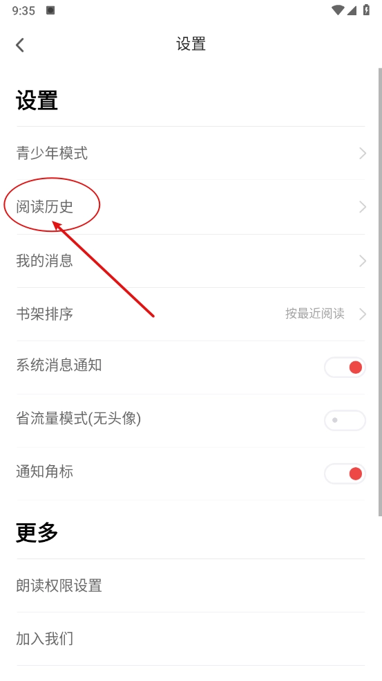 2、如图,在设置中点击"阅读历史"。