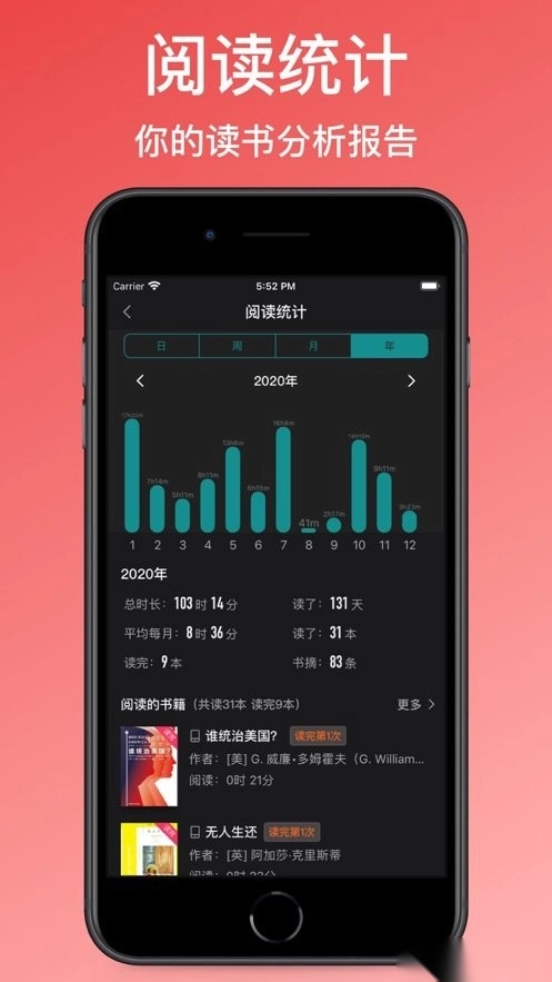 多维度、多方面详细展示自己阅读状况,阅读时间、阅读类型、阅读天数、阅读进度、阅读偏好等,轻松回溯自己过往的阅读状况;
