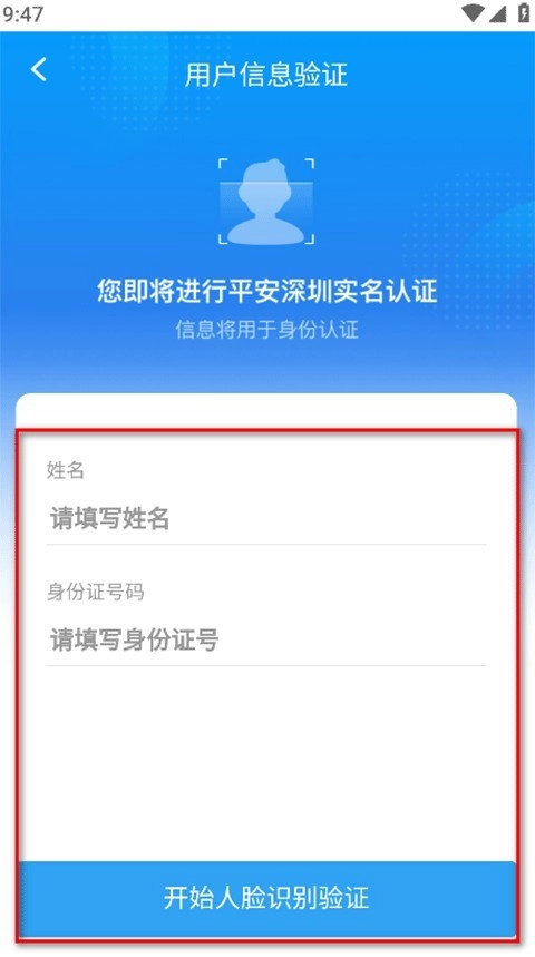 5、请接着填写姓名与身份证号,再点击“开始人脸识别验证”按钮。