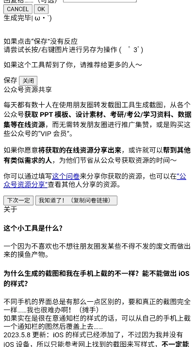本工具生成的截图,仅可用于个人应付各类强制要求转发朋友圈的情形,请勿批量生成截图或将截图用于造谣诽谤、微商宣传等非法或令人反感的用途,请勿用于商业用途,二次部署请勿删除原作者相关信息。