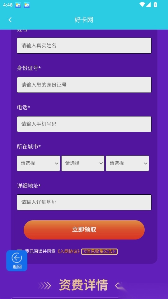4.接下来填写姓名、身份证号、手机号码以及详细地址等信息,然后点击“立即领取”按钮,就能完成流量卡的领取操作了。