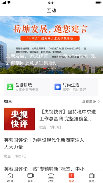 集新闻资讯、公众信息、政民互动于一体的移动互联网聚合门户。“i岳塘”汇集岳塘本地新闻资讯并时时更新,设置了新闻资讯、政务服务、线上问政等版块,为受众提供“有深度、有温度、最贴心”的内容和服务。打开“i岳塘”,这里有最新鲜的新闻大餐--最权威的重大时政报道、最接地气的民生资讯;有贴心的本地政务、生活服务;还有最直接便捷的问政咨询通道……