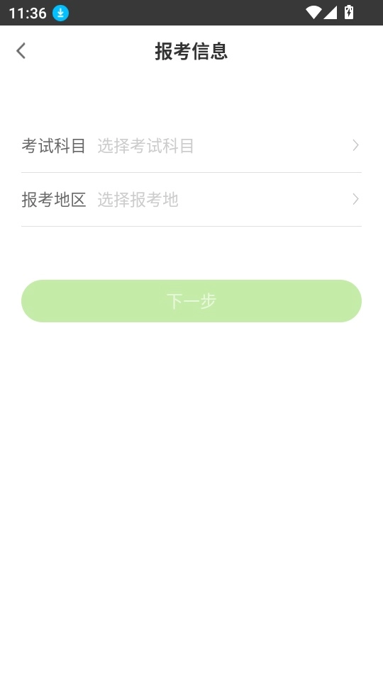3、进入报考信息界面后,即可选择所需的考试科目与报考地,随后点击“下一步”按钮开展后续操作。