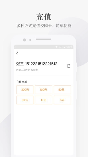 从此告别现金和排队,躺在床上就能给校园卡充值,多种支付方式可选,秒速到账,轻松便捷;还可随时随地查询余额和交易明细,让校园支付每一笔都清清楚楚;在线挂失和捡卡登记,让校园卡不怕丢失,轻松安全管理校园卡;缴电费网费水费缴考试费用缴学费,领先打造智能化校园生活。