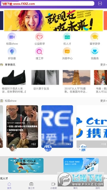 享享校整合了学习娱乐、创意需求、求职招聘、在线教育等多种功能。与其他校园类软件不同的是,我们加入了更多独具特色的功能模块,像个人简历视频展示、在线面试平台、校园风采秀、个人及企业微讯等,旨在让校园学习与生活更加丰富多彩、充满趣味。